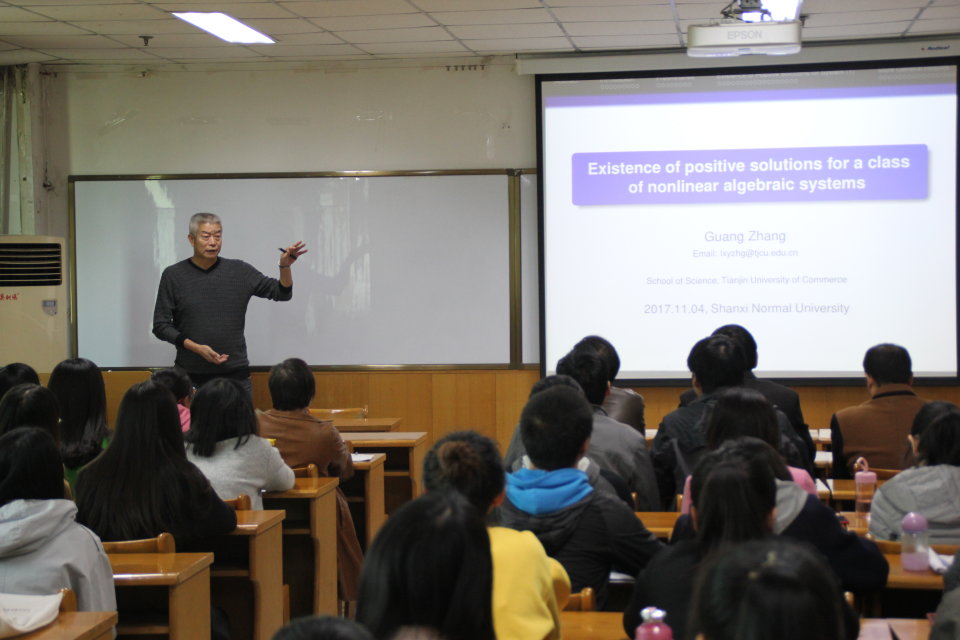 11月4日上午9时,天津商业大学教授张广应邀来我院科学会堂A710报告厅作报告——一类非线性代数系统正解的存在性。报告会由我院副教授孙树林主持。学院相关专业教师与研究生参加了本次报告会。
