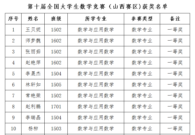 近日,第十届全国大学生数学竞赛山西赛区成绩揭晓,太阳成集团官方网站在本次竞赛中再创佳绩,共172人参赛,51人获奖。