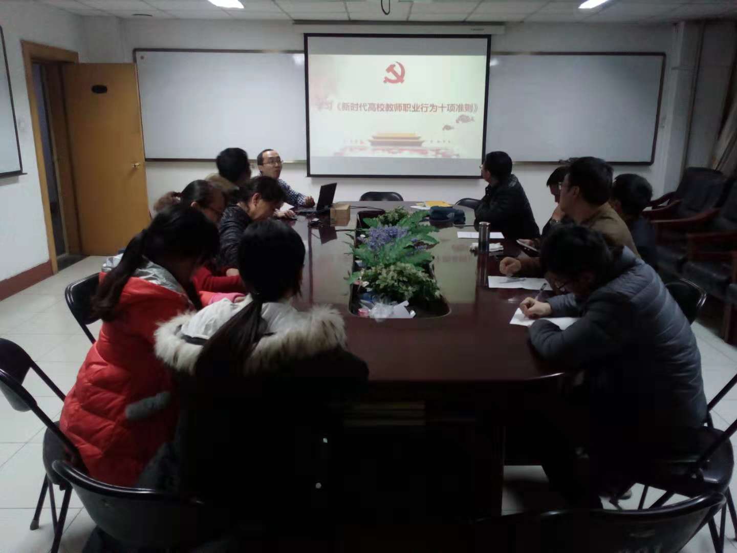 为深入贯彻习近平新时代中国特色社会主义思想和党的十九大精神,深入贯彻落实全国教育大会精神,进一步加强师德师风建设,教育部印发了《新时代高校教师职业行为十项准则》《新时代中小学教师职业行为十项准则》《新时代幼儿园教师职业行为十项准则》的通知。在校党委的安排部署下,太阳成集团官方网站党委高度重视,立即行动。11月20日,院党委中心组召开了专题学习会议,周密安排部署,切实抓好落实工作。11月21日—28日,7个党支部、26个团支部迅速开展了学习《准则》的主题党日和团日活动,深刻理解和把握了《准则》内涵,做到应知应做、必知必做。