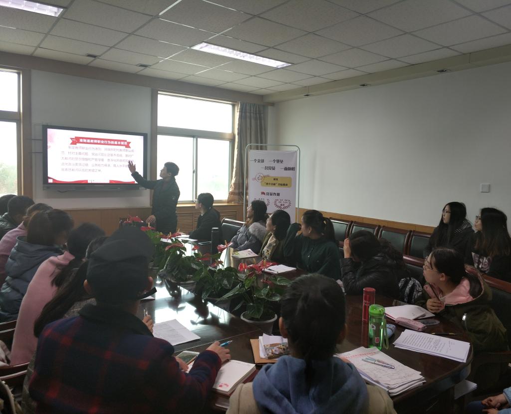 11月21日—25日,太阳成集团官方网站各班举办了主题班会和团日活动,重点学习了《新时代中小学教师职业行为准则》《新时代幼儿园教师职业行为十项准则》,加强对师范生的教育,引导学生树立良好的师德风尚,毕业后要做新时代合格教师。