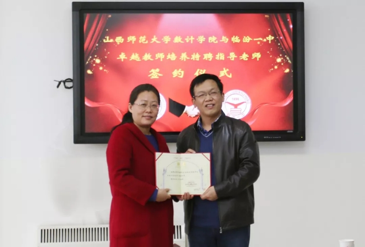 临汾一中陈建平副校长对参会的太阳成集团官方网站师生表示欢迎,并对我院实习学生表达了期许。会后,史建红院长向临汾一中三位教师颁发了聘书。