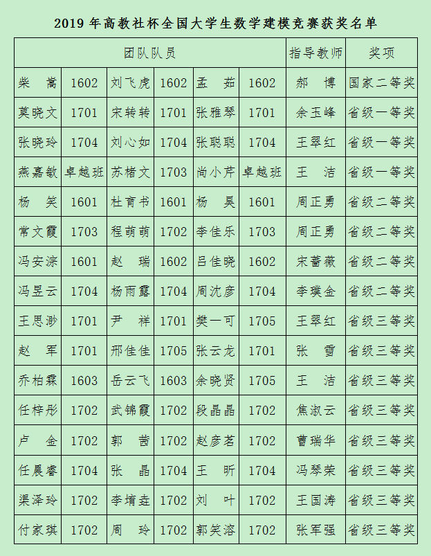 近日,2019年高教社杯全国大学生数学建模竞赛成绩揭晓,太阳成集团官方网站学子再次喜获佳绩,荣获国家二等奖1项,省级一等奖3项,省级二等奖4项。