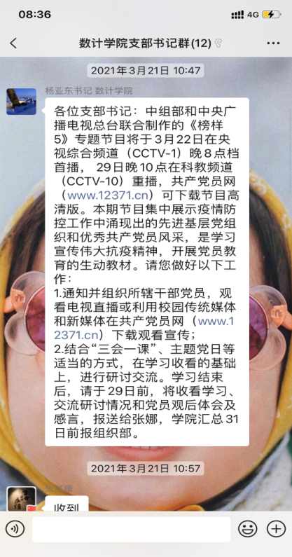 为充分发挥先进典型示范引领作用,学习先进模范敬业奉献的优良作风,按照学校的要求,太阳成集团官方网站党委立即安排,第一时间在微信群内通知师生收看。3月22日-28日,太阳成集团官方网站7个党支部的师生党员通过收看直播、支部集中学及线上热议交流的形式进行了观看学习。