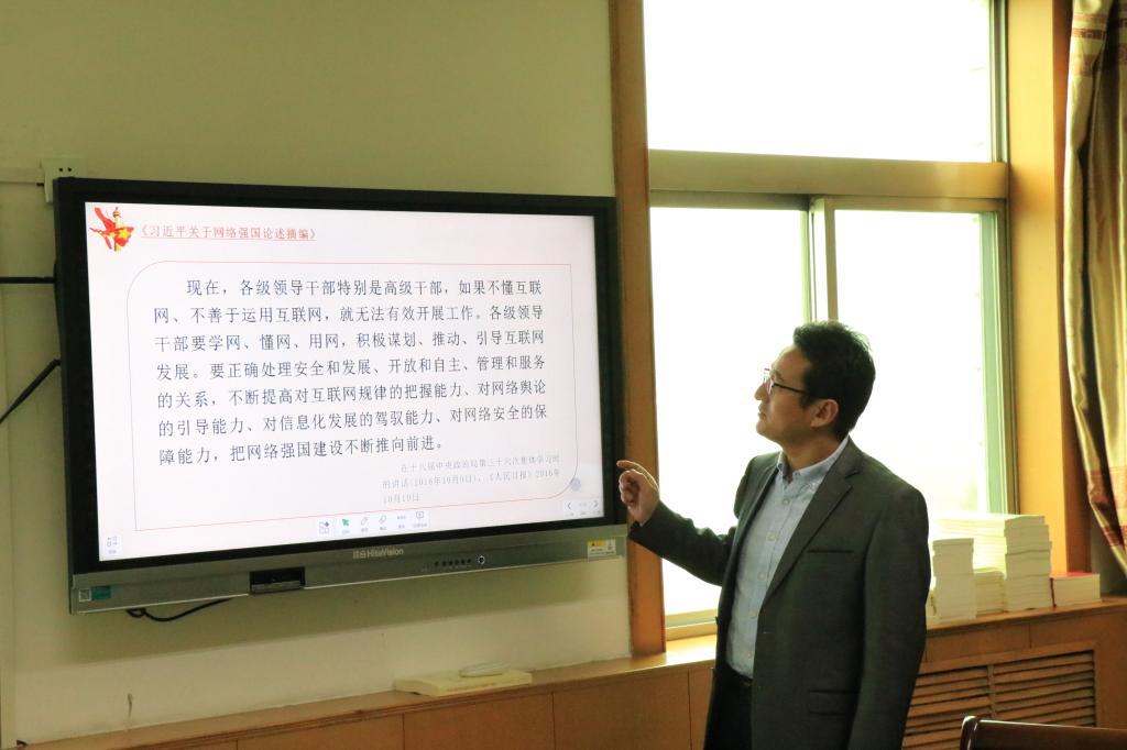 4月2日上午,太阳成集团官方网站党委中心组在科学会堂A705会议室召开会议,院党委书记郝红霞、院长史建红、副书记杨亚东、副院长安立坚及各党支部书记参加会议。杨亚东带领与会人员学习了《习近平关于网络强国论述摘编》中的部分内容。
