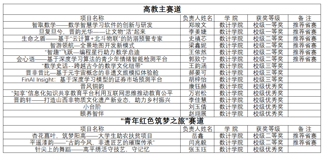 本次大赛,我院积极组织各年级同学报名参赛,共计96支队伍655人参赛,在校赛阶段,我院共有17个项目获奖。其中包括高教主赛道校级一等奖2项,校级二等奖4项,校级三等奖3项,校级优秀奖5项;“青年红色筑梦之旅”赛道校级二等奖2项,校级优秀奖1项。