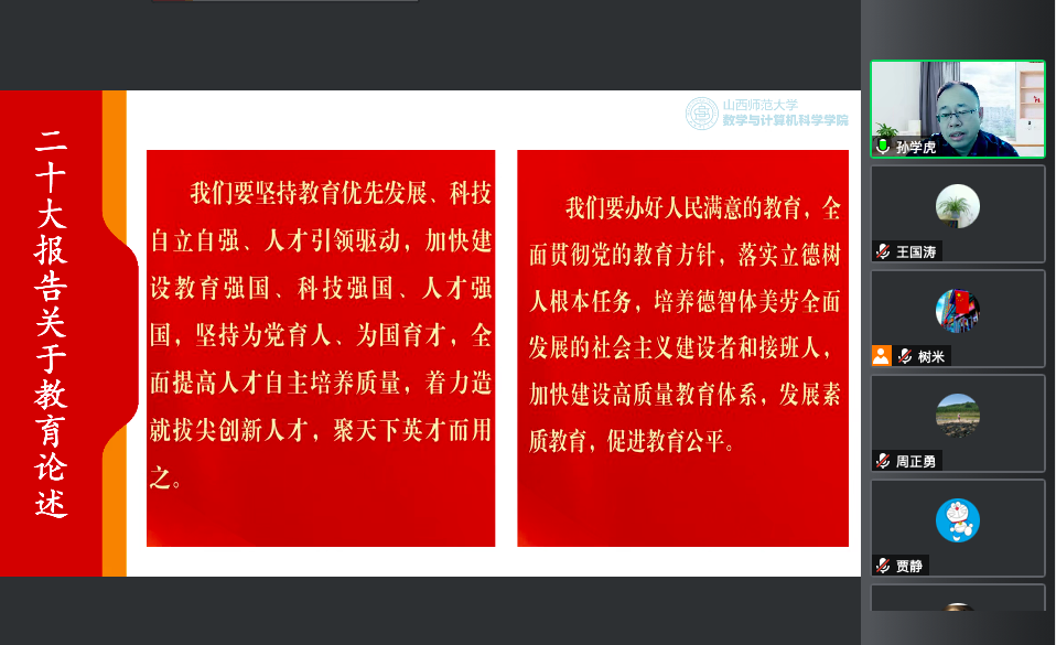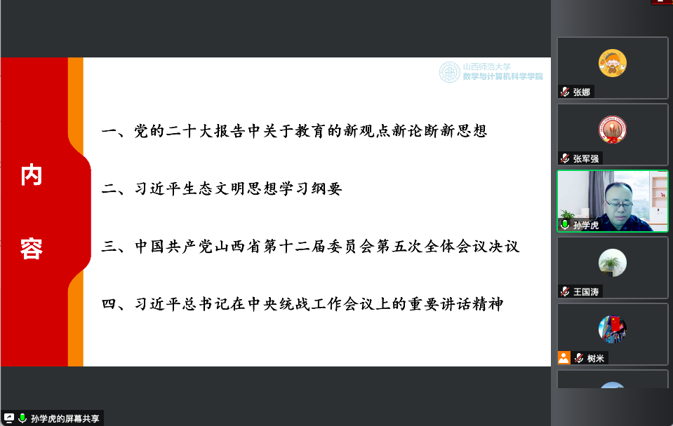 院党委书记孙学虎专题领学了党的二十大报告中关于教育的新观点、新论述、新思想以及《习近平生态文明思想学习纲要》,学习了《中国共产党山西省第十二届委员会第五次全体会议决议》及习近平总书记在中央统战工作会议上的重要讲话精神。