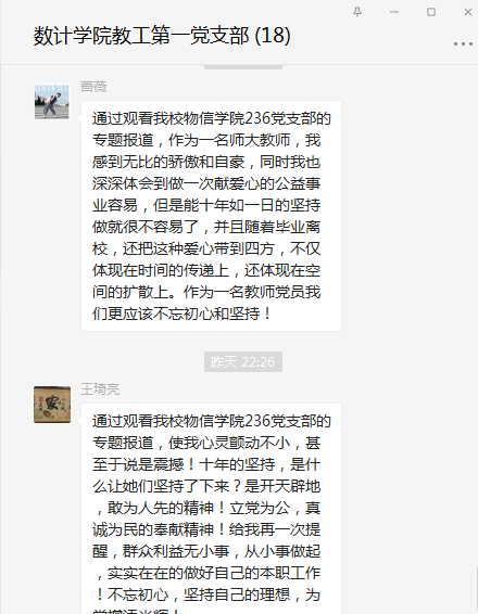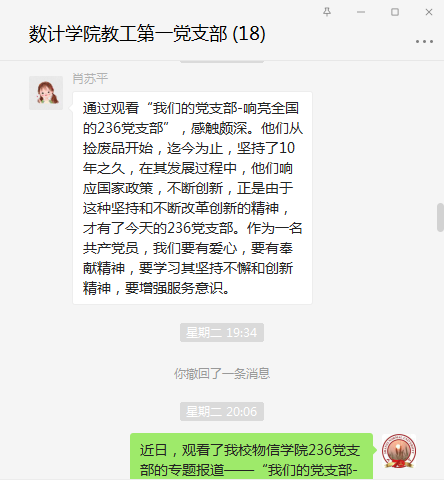近日,按照校党委组织部的安排,我支部党员自行观看了“百集建党纪录片”《我们的党支部---响亮全国的236党支部》,并在支部群里进行了体会发言和交流讨论。
